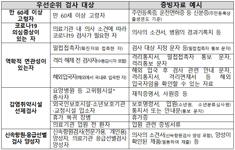 - 재직증명서·보호명령서·휴가증·입원관련 서류 등 증빙자료 지참 후 선별진료소에서 PCR 검사를 받을 수 있음.