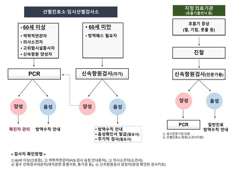 - PCR 검사 가능 경우: ①전문가용 신속항원검사 양성반응, ②코로나19 검사 필요 의사 소견서 지참(선별진료소에서 PCR도 가능)