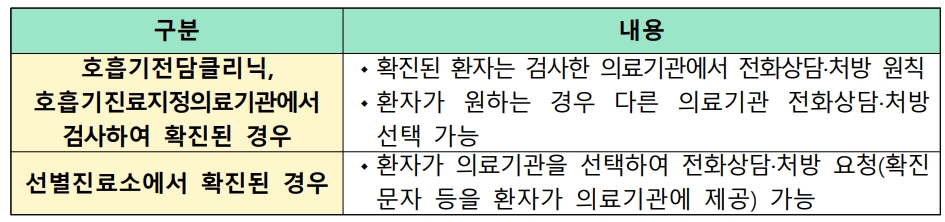 - 단, 해당 의료기관에서 진료 받고 싶지 않다면, 평소 다니던 병원 또는 다른 의료기관에 연락 후 전화상담 및 처방 가능