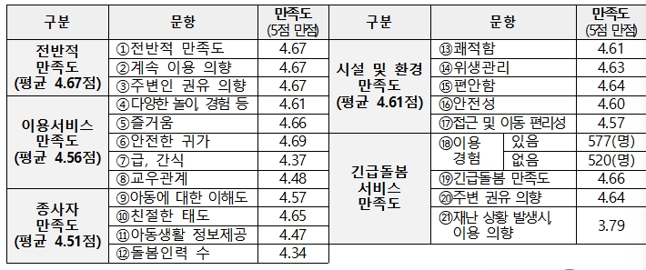 2021년 12월 말 기준 전국 694개소에서 약 1만 7천여 명의 아동들이 이용하였으며, 이용자 만족도 조사 결과에서 91.6점의 높은 점수를 달성하는 등 양질의 돌봄 서비스를 제공 중입니다
