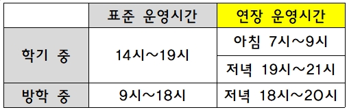 맞벌이 가구의 출·퇴근 시간 초등 돌봄 지원을 위해 다함께 돌봄센터 표준 운영시간 이외 아침과 저녁 각각 2시간씩 연장하여 운영하는 사업입니다.